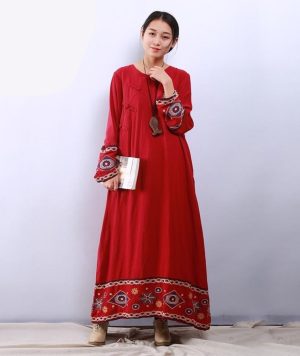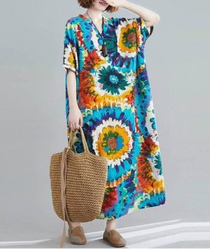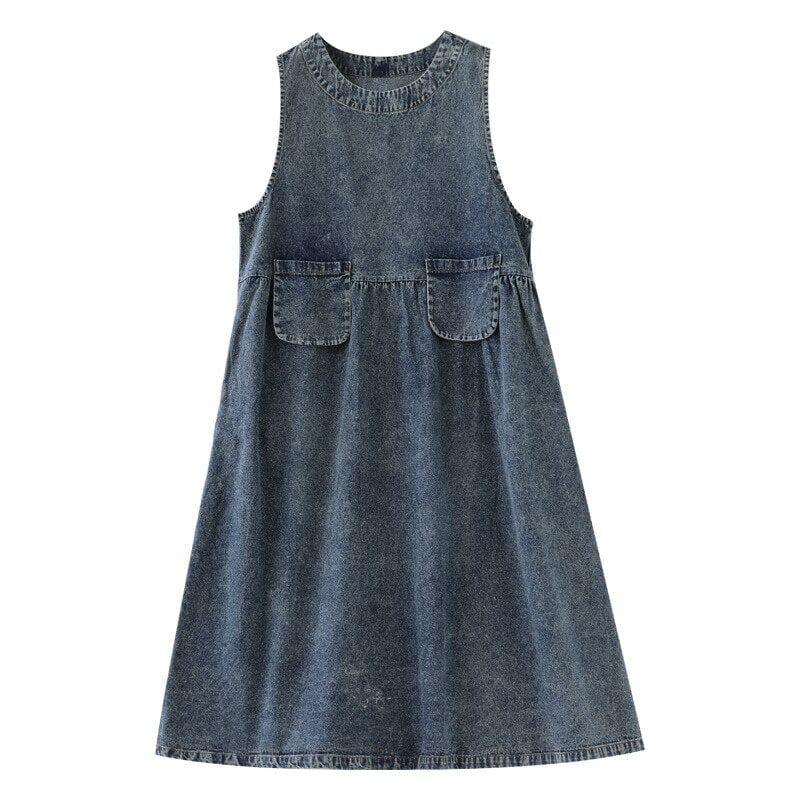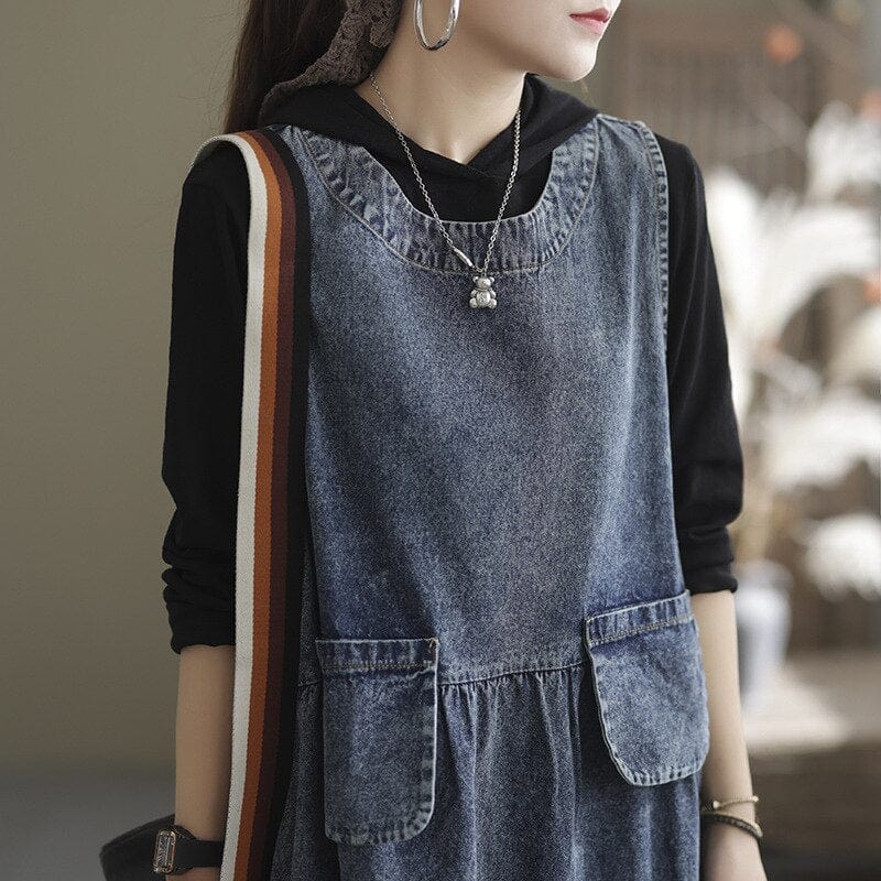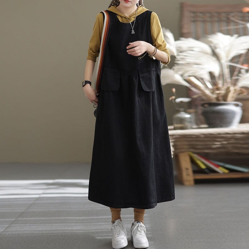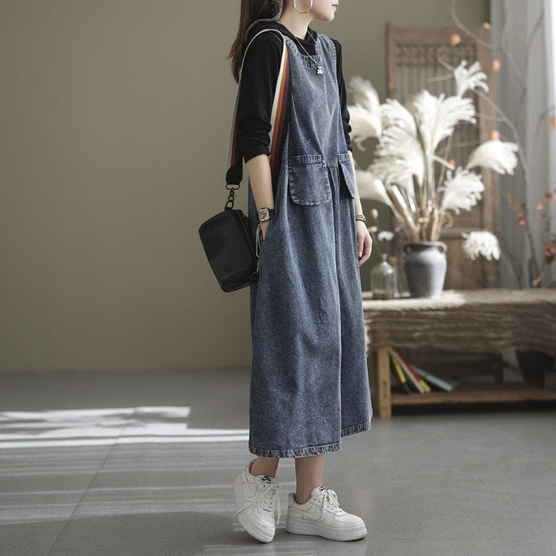 This overall dress is an excellent work of creativity. style.andcomfort. It comesina very simple design. yet is still very classy. It is styled in a loose silhouette that settles around thecalves in a very admirable way. The neckline is fashioned in a beautiful O Neck cut. which adds a nice touch to the overall style.