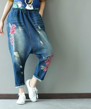 Floral Embroidered Distressed Harem Jeans
