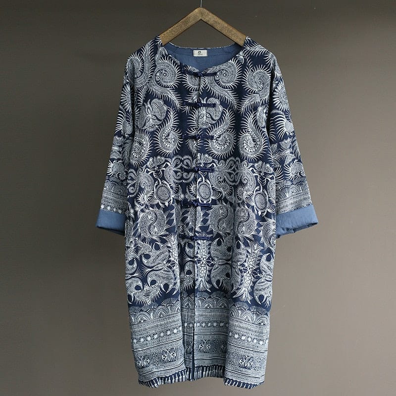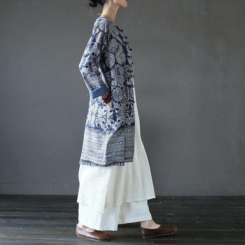 Lounge around your home staying effortlessly stylish in this long and comfortable cardigan made to stay or to play. It’s blue and white intricate Asian inspired pattern work makes it perfect to wear out day or night. Wear it over a simple tank top or with a complimenting patterned blouse to make a zen statement. Wherever you decide to take this long linen beauty. be ready to make a statement made in comfort.