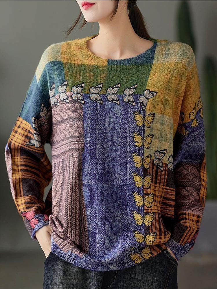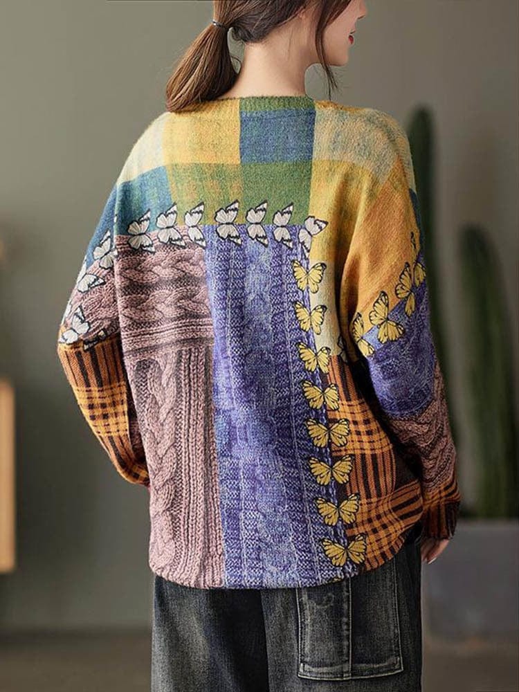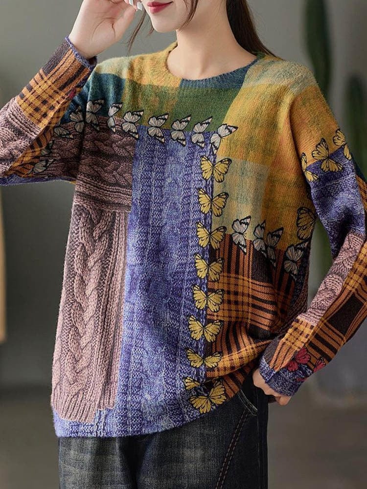 Butterfly Print O-Neck Sweater