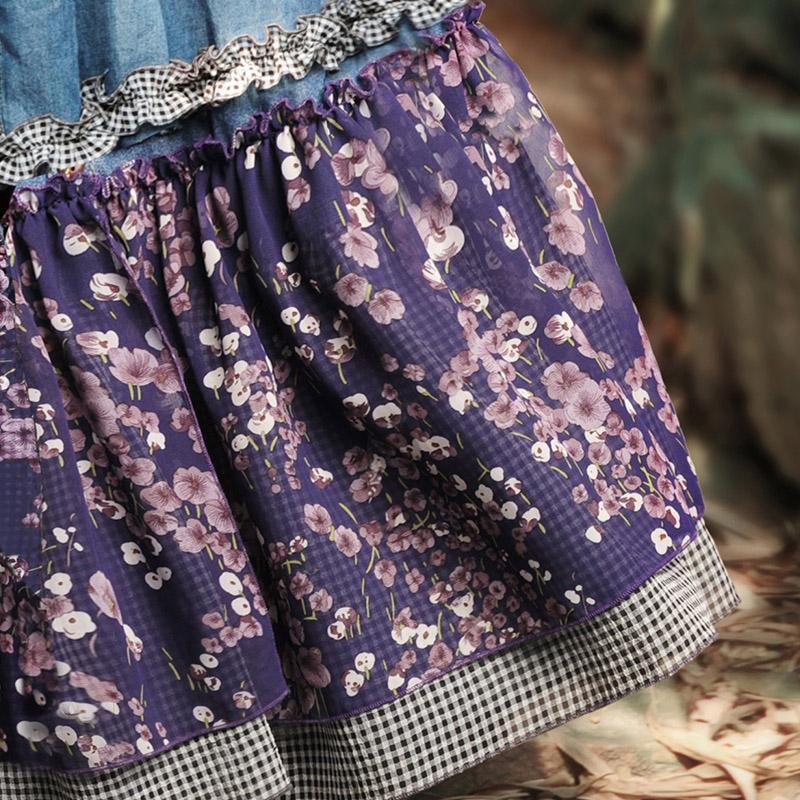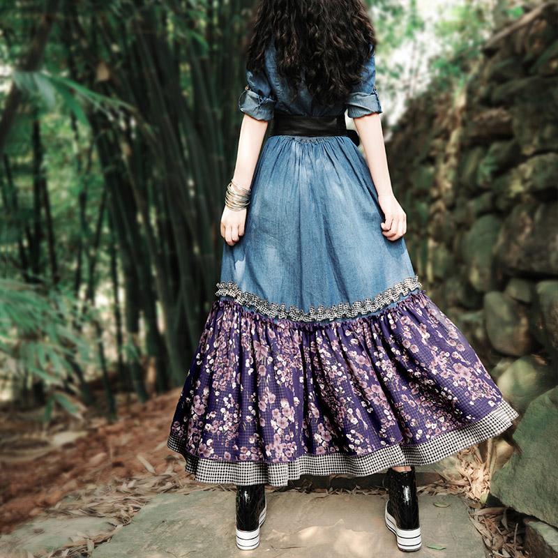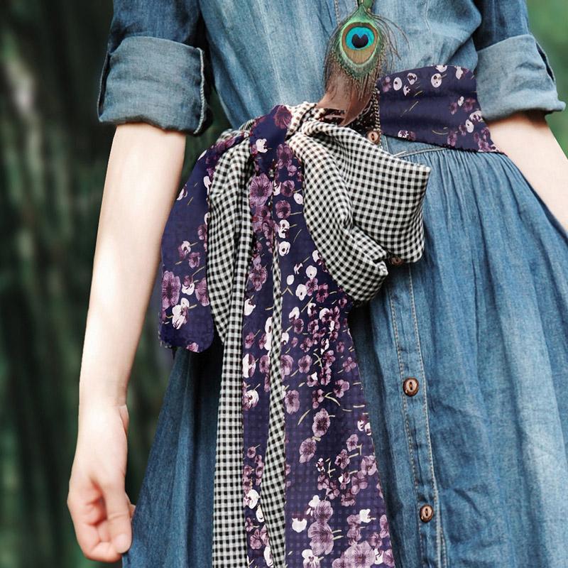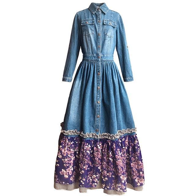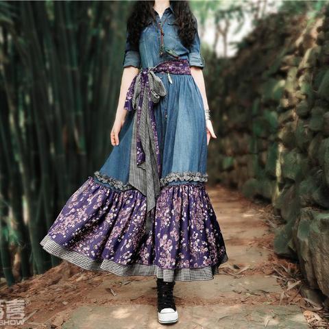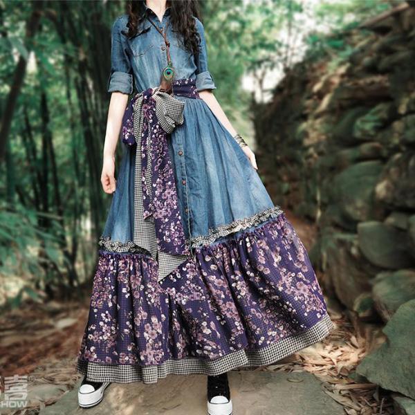 Show your radiant and playful feminine side in this denim maxi dress with purple floral patchwork. and black and white checker trim. Top to bottom buttons. empire waist. turn-down collar. and three-quarter length sleeves that easily roll-up. What really adds a feminine flowy feel is the floral patchwork. Add a little more accent to this denim dress with slipper shoes or ankle boots. A little hippie. a little vintage. and a lotof happiness. This dress is great for twirling on the dance floor or charming your date on an afternoon picnic. Comes with matching scarf/belt