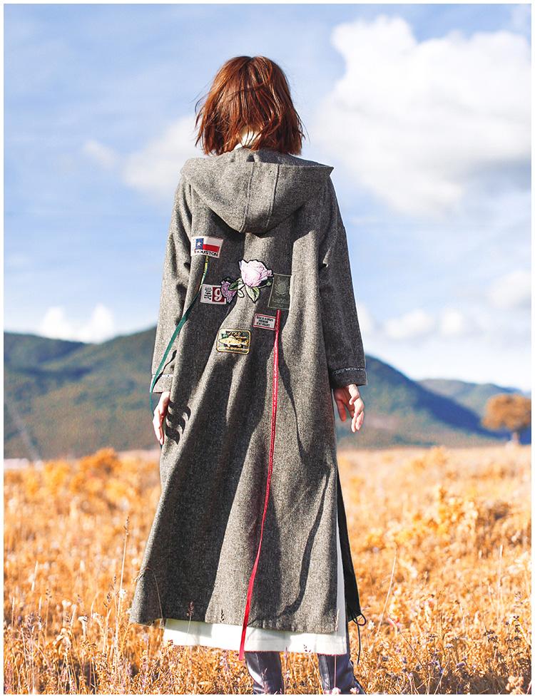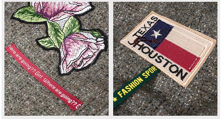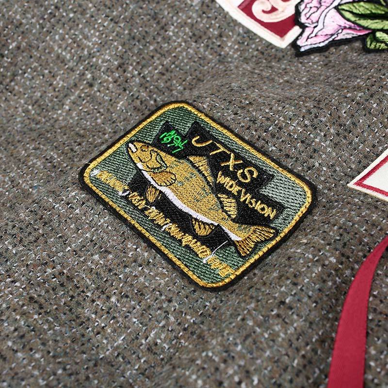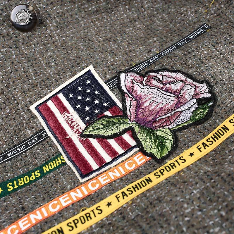 Don`t wait to add this wool coat to your casual attire. It is simple. comes in grey that will go along with all of your clothes. it has the perfect and comfortable loose fit. and moreover. it is decorated with interesting badges on the front and in the back such as a detailed fish. colorful flowers and the Americanflag. Chic yet simple.