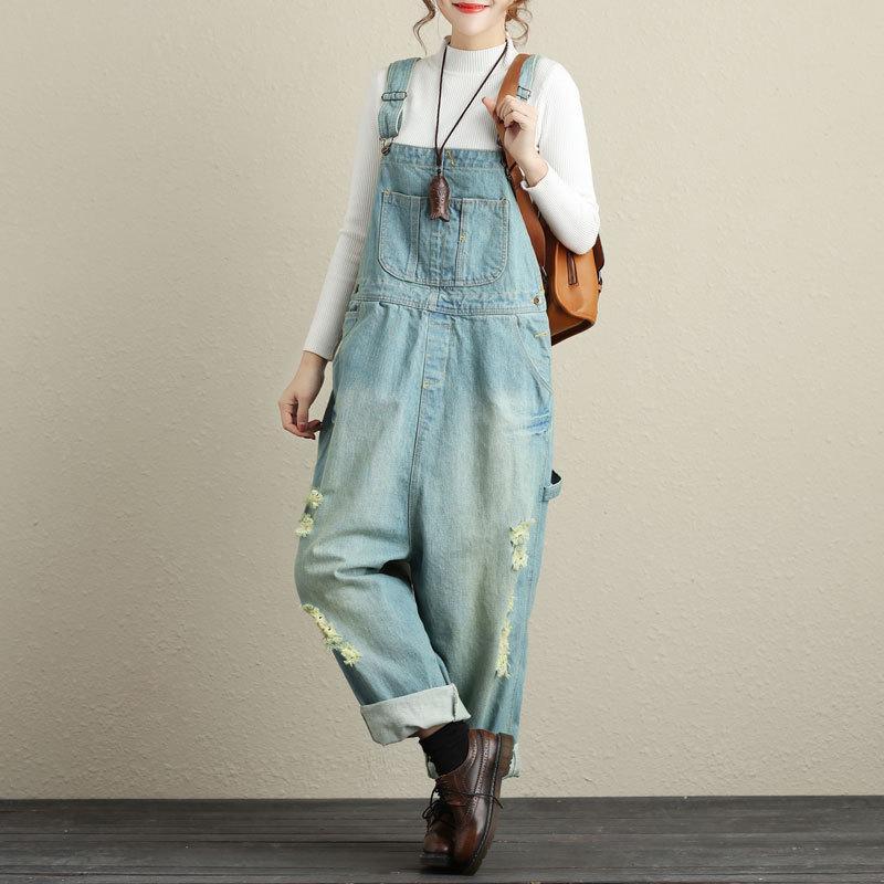Country style with a chic twist is shown here in our Loose Ripped Denim Overall. Durable denim material has been distressed for a fashionable twist on the classic overalls. This fabric. when paired with its low hanging fit. gives this piece a resemblance to harem pants for an ideal streetwear style. Wear these overalls over-top your favorite top paired with boots or heels for a high fashion look that can be worn day to day.