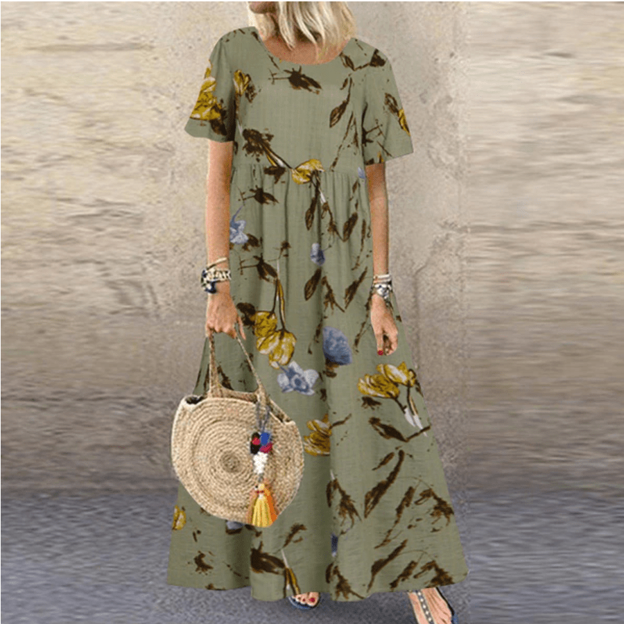 The Mona Bohemian Floral Maxi Dress is perfect for your next getaway. This beautiful dress features a nature-inspired print and is made from a rayon and cotton blend material. It has a long. ankle length silhouette with short sleeves and comes in two colors!