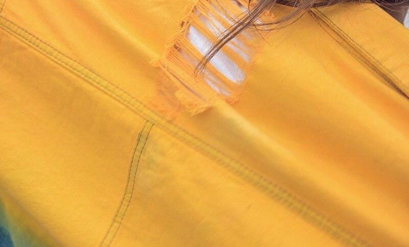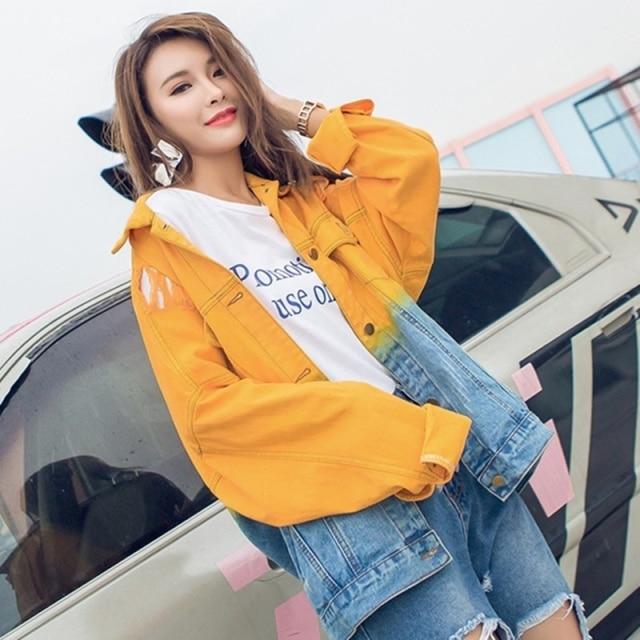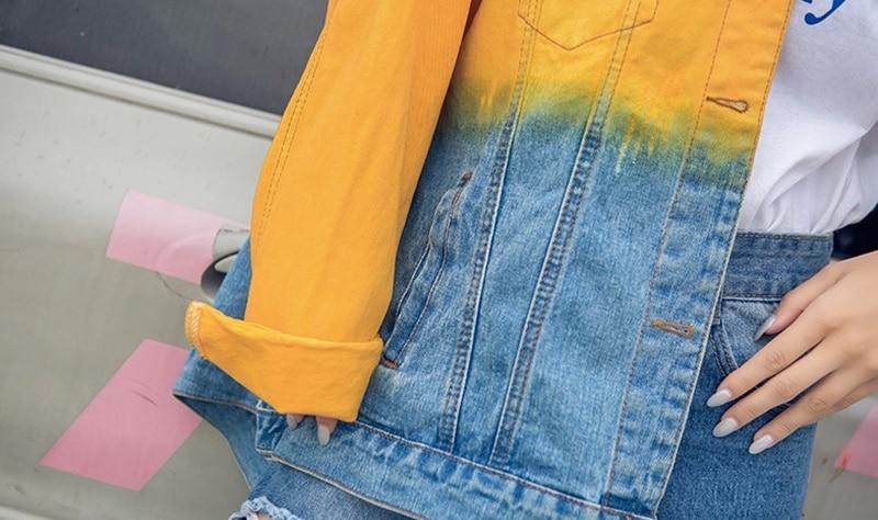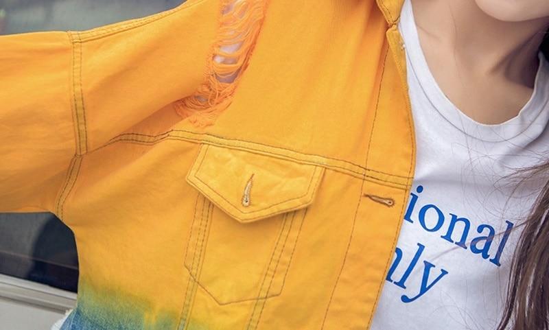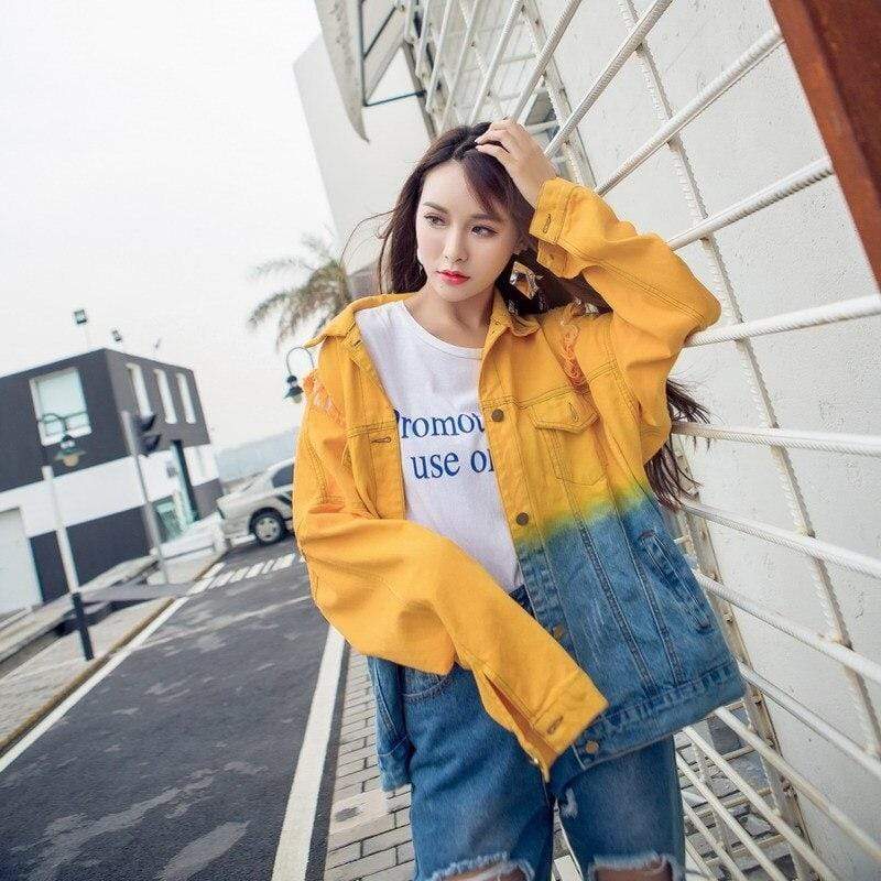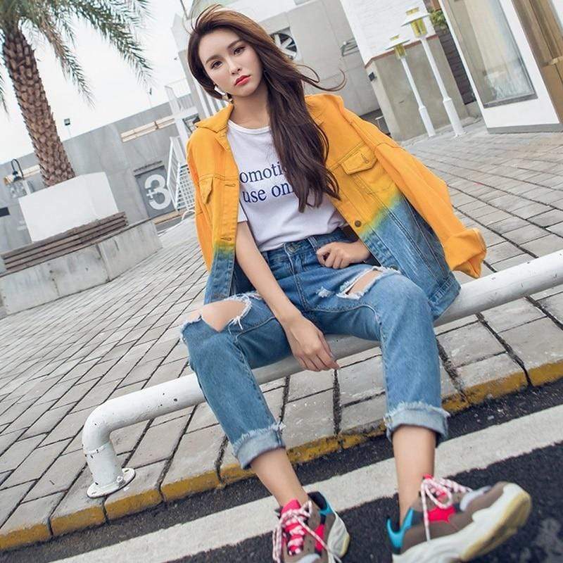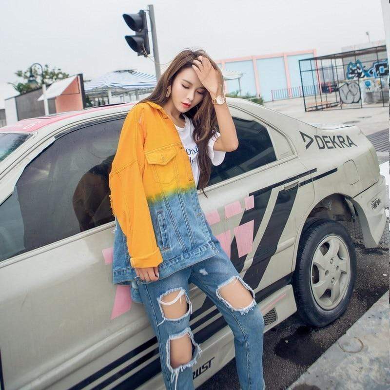 Look cool and relaxed in our Ombre Gradient Distressed Denim Jacket. The oversized fit. distressed embellishments. and multicolored denim material of this jacket give it a youthful and chill feel that can be added to any outfit to bring a relaxed casual vibe to your day. The bright colors bring a vivid personality to this jacket. It will be the perfect summer piece with its lively look that will be sure to breathe life into your wardrobe. Slip this over a tank or tee paired with denim shorts and heels for a fun street look that brings out your femininity.