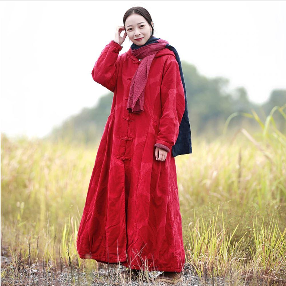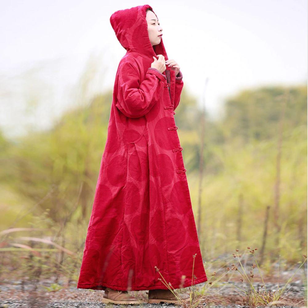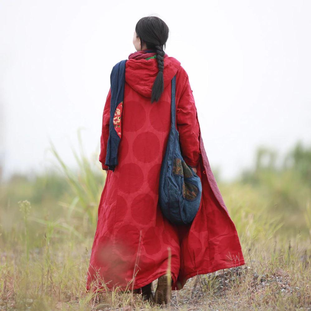 There is not a single piece more practical nor more simple and fashionable then this Hooded Coat. It has a distinguishable red color and an almost unnoticeablecircle pattern on the outside. Fitted at the upper part and then spreading from the waist down. we can say that it has an A-line shape that will enhance your body curves. Wearing this Parka will not only keep you warm but it will also make you look stylish.