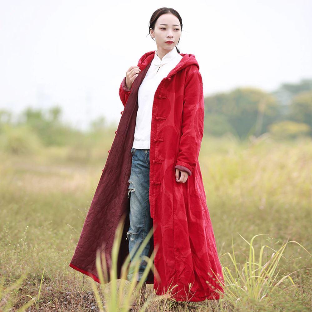 There is not a single piece more practical nor more simple and fashionable then this Hooded Coat. It has a distinguishable red color and an almost unnoticeablecircle pattern on the outside. Fitted at the upper part and then spreading from the waist down. we can say that it has an A-line shape that will enhance your body curves. Wearing this Parka will not only keep you warm but it will also make you look stylish.