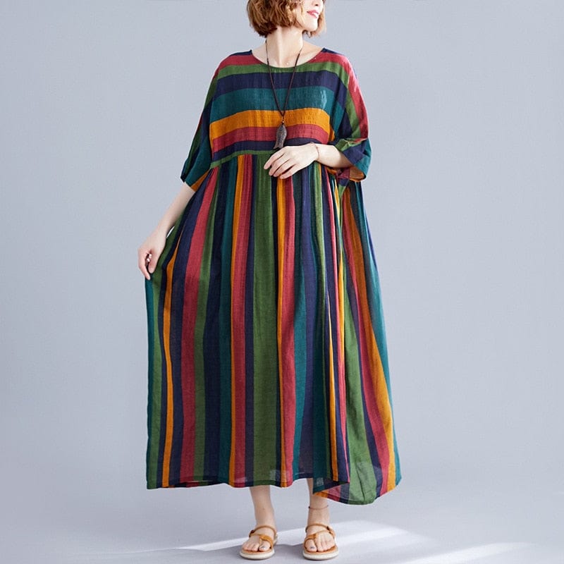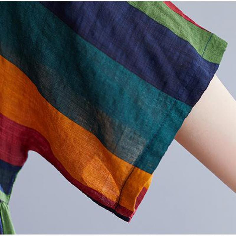 Bring your style into bloom with this Retro Rainbow Striped Loose Dress. Thismidi dress features trendystriped detailing and is an absolute staple to add to your collection this summer-fall. Withshortsleeves and a round neckline. this dress is perfect for the transition of seasons. Team withsneakers and a denim jacket for a stylish casual look perfect for city getaways or summer outings.