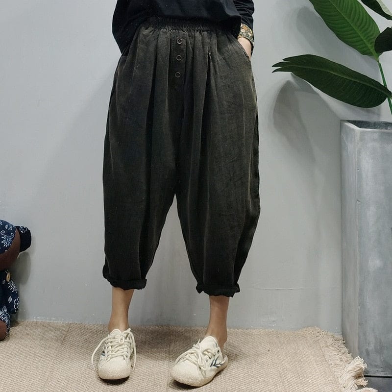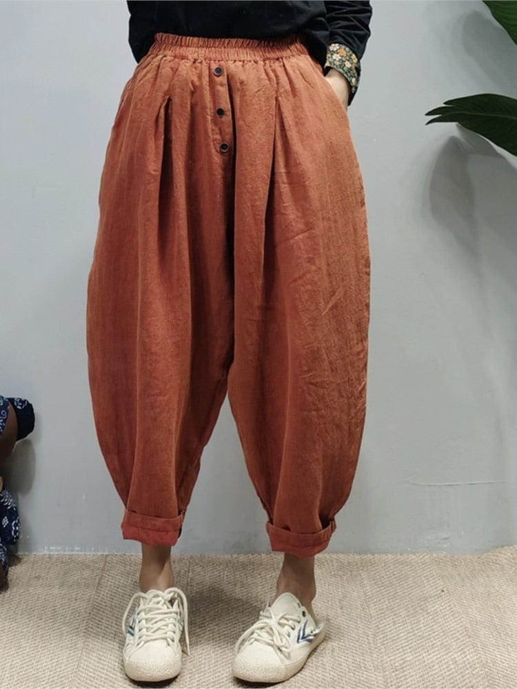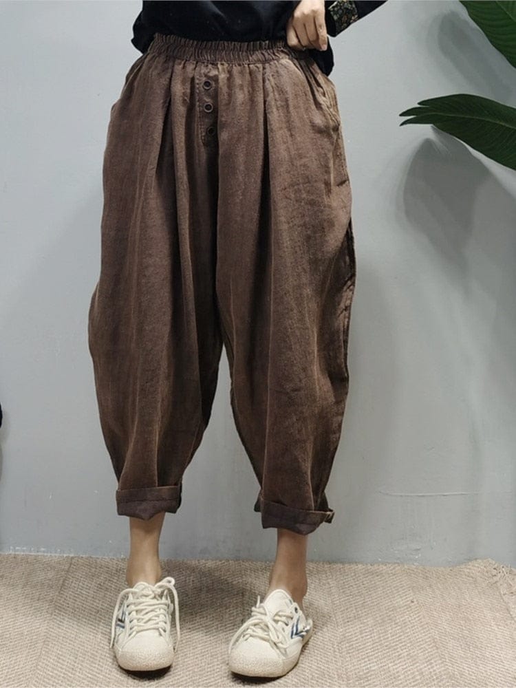 Feel relaxed and laid back in our easy-going Rolled Up Cotton And Linen Trousers. These trousershave a loose fit and elastic waist to suit your comfort that you are looking for to enjoy your daily tasks. The warm brown color keeps these trousers neutral making them versatile and easy to style. A simple button-up shirt or band tee can make this outfit complete. The vintage flair this piece has only added to the warmth and inviting look. You can easily wear them day or night for any casual event that calls for activity that you will need to stay comfortable for.