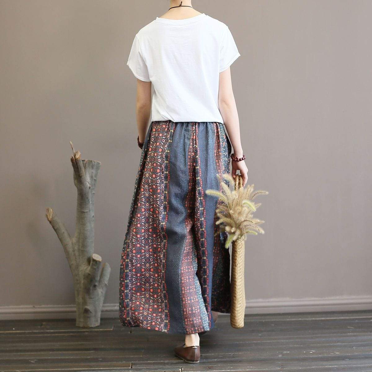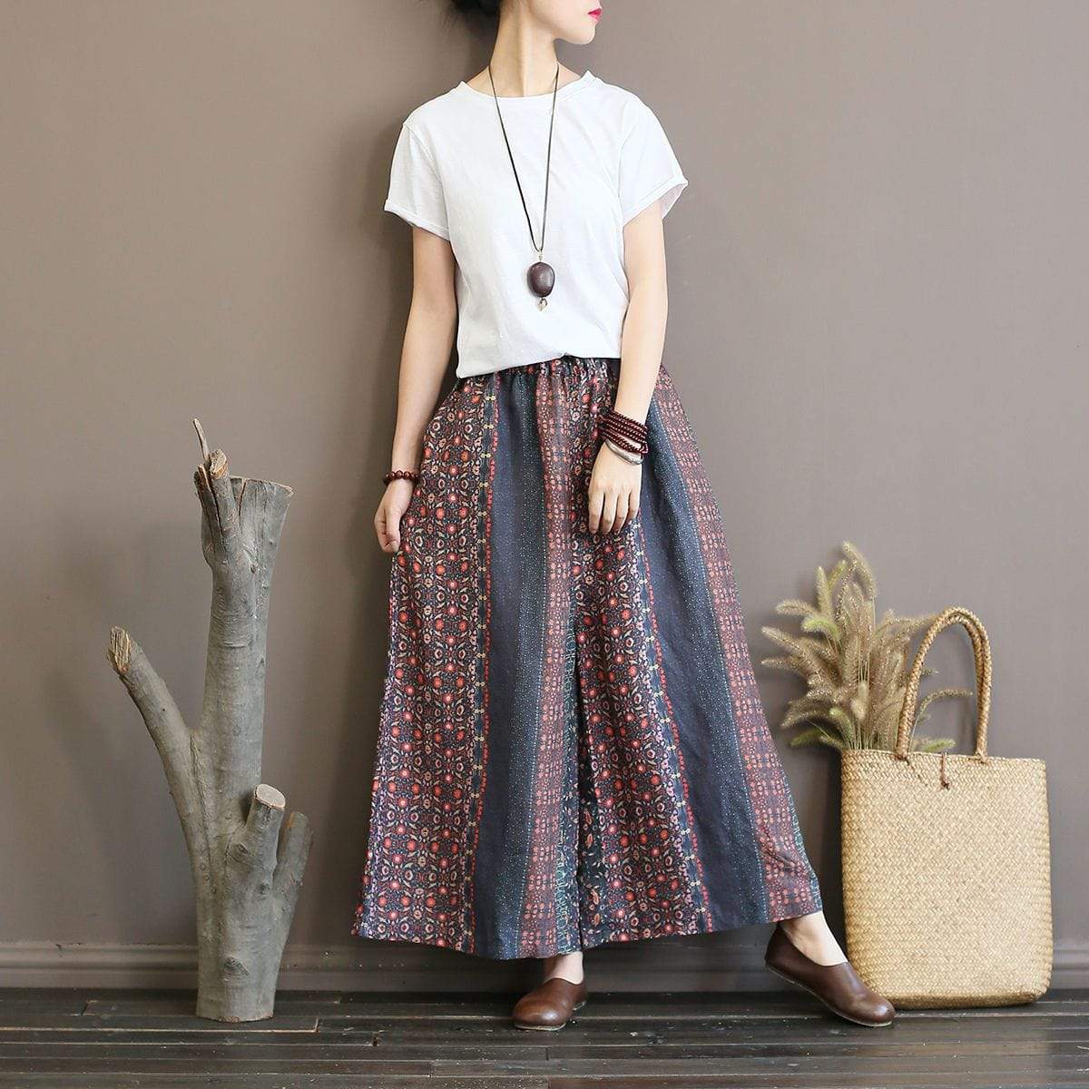 Feel relaxed while creating a fun look in our Zen Tribe Ramie Palazzo Pants. Ramie material is given a worn washed-out look for a relaxing and zen vibe while its tribal pattern pops with vivid colors to add a lively personality. With its elastic waist and wide legs. you can easily slip on these pants and stay comfy all day long. Wear them for a calm day out walking on the shore paired with a tee and pendant necklace to look effortlessly chic.