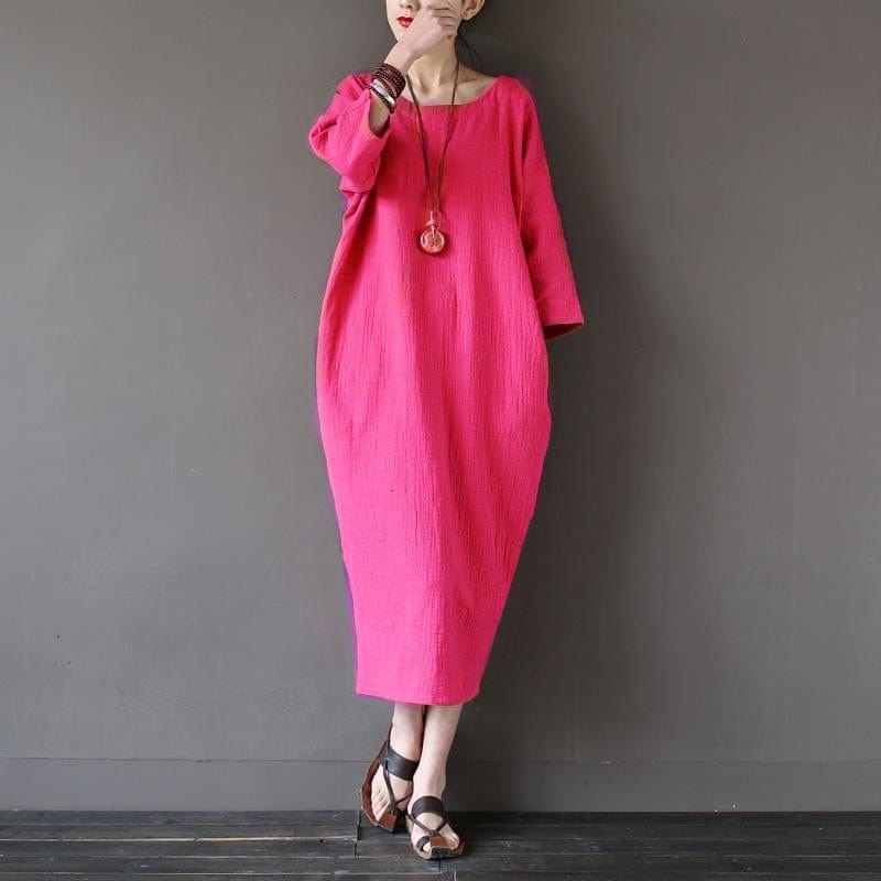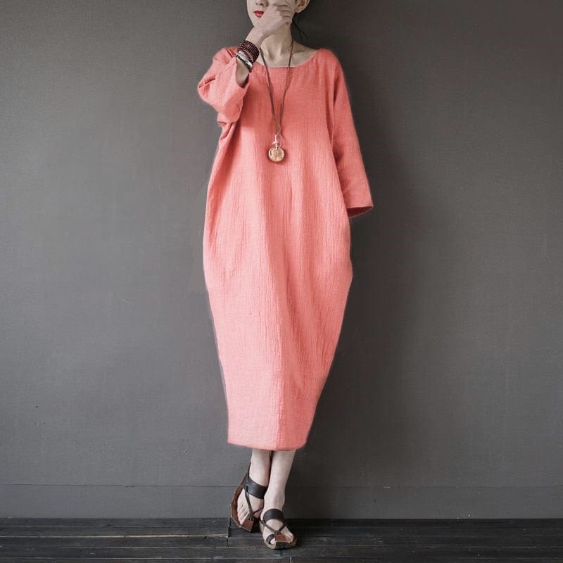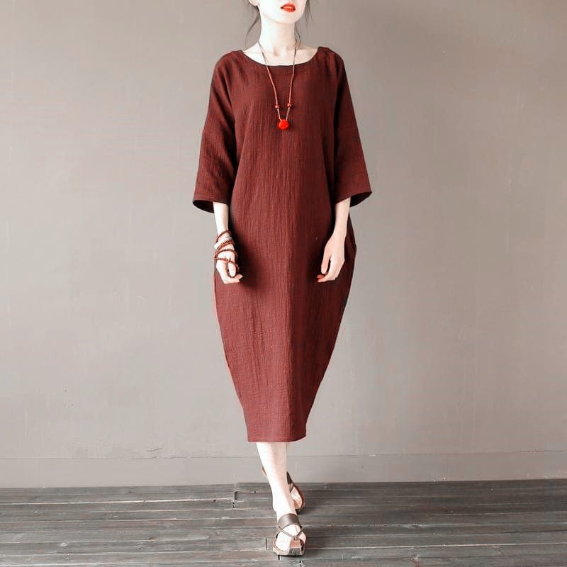 Stand out and stand tall in our new cotton linenmididress. It’s bold yet simple with plenty of room to expand your body. heart. and soul! On cooler days. this3/4 sleeve dress will keep you comfortable. Cotton and linen projectspeace andcalm and we hope you will feel that and carry it through your day whether you’re just out shopping or at the podium giving a lecture on mid-century French literature. This dress is casual enough for everyday wear andis perfect for hanging out with the girls. Some colorful artistic jewelry; necklaces. bracelets and anklets will add some zing to your look.