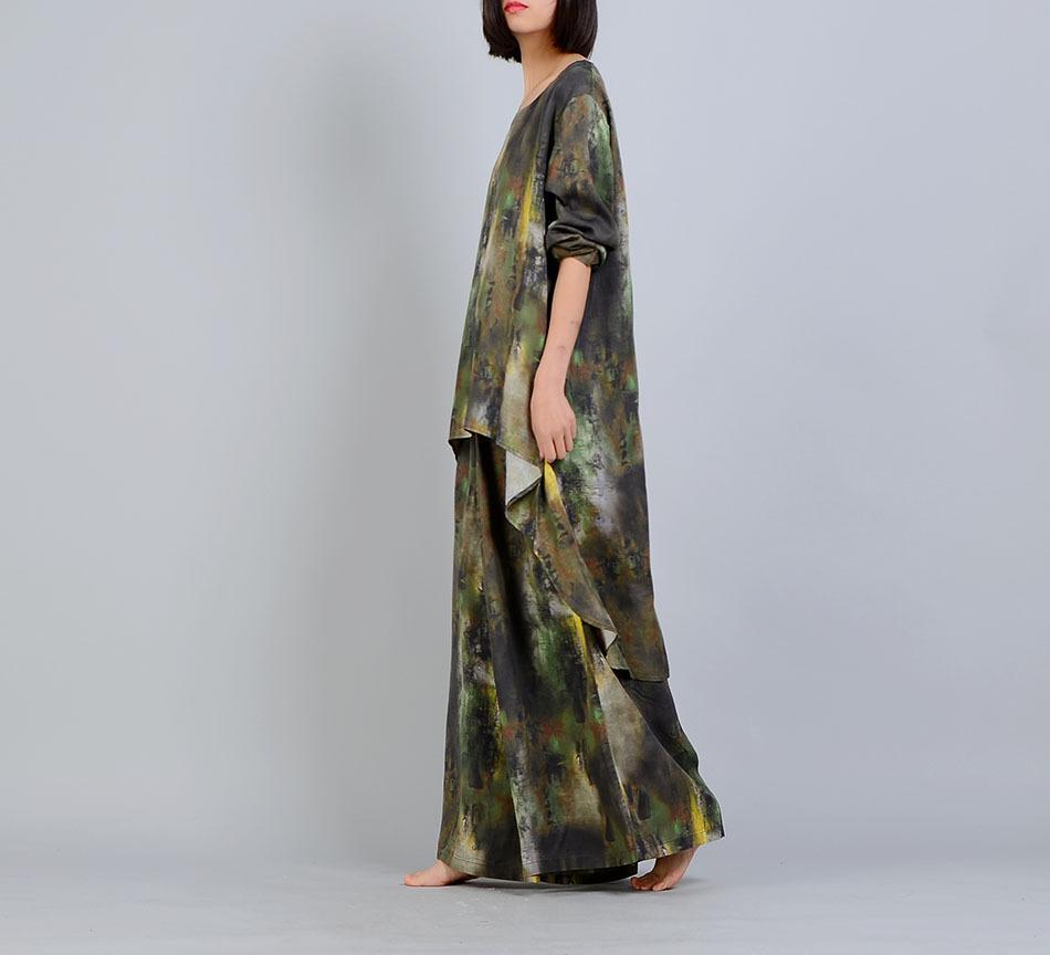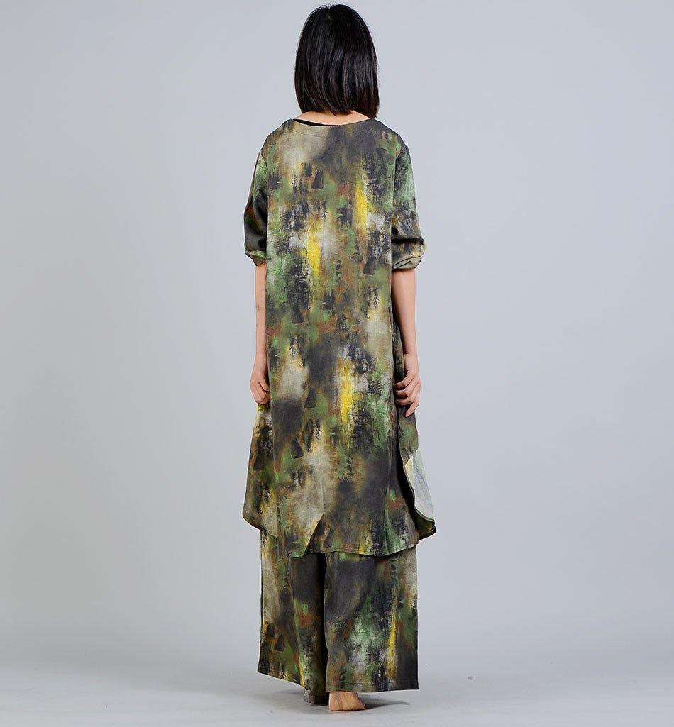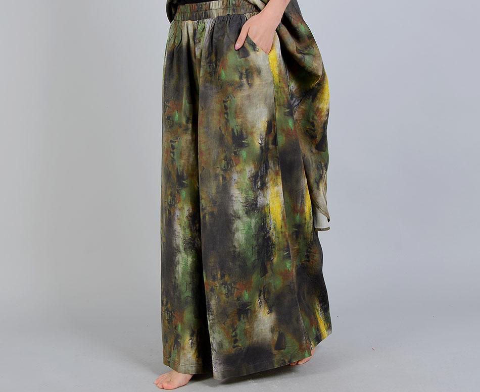 Casual and elegant are the words for this comfortable two-piece suit in beautifully dyed silk and linen. Art inspired with natural colors blending into one another give a watercolor effect. Loose and flowing with a stylish asymmetrical design. wide flare pants. and pockets. This casual and elegant vintage pantsuit will keep you in style for a night at the theater. dinner dates or just looking good in the office. Be yourself. be original this spring with our unique silk linen pantsuit. One size fits most. Available in natural color combinations: Brown or Green