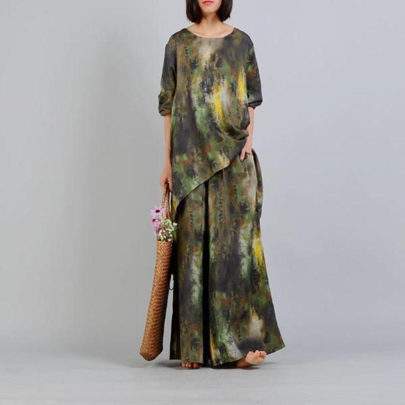 Casual and elegant are the words for this comfortable two-piece suit in beautifully dyed silk and linen. Art inspired with natural colors blending into one another give a watercolor effect. Loose and flowing with a stylish asymmetrical design. wide flare pants. and pockets. This casual and elegant vintage pantsuit will keep you in style for a night at the theater. dinner dates or just looking good in the office. Be yourself. be original this spring with our unique silk linen pantsuit. One size fits most. Available in natural color combinations: Brown or Green